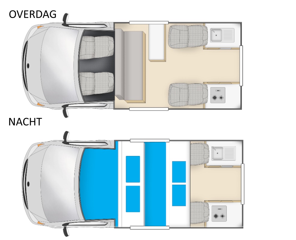 Voordelige familiecamper met beperkte ruimte. Niet te groot en eenvoudig in gebruik. Geen toilet/douche en enkel koud water. Minimum leeftijd om deze camper te huren is 18 jaar. Geschikt voor twee volwassenen en twee kleine kinderen. Er zijn twee baby- of kinderzitjes te plaatsen. Tweepersoonsbed van 1.85 bij 1.24m en tweepersoonsbed (top bunk) van 2.00 bij 1.20 m (maximale gewicht is 200 kg). Binnenhoogte is 1.95-1.98m. De genoemde afmetingen kunnen in de praktijk enigszins afwijken.