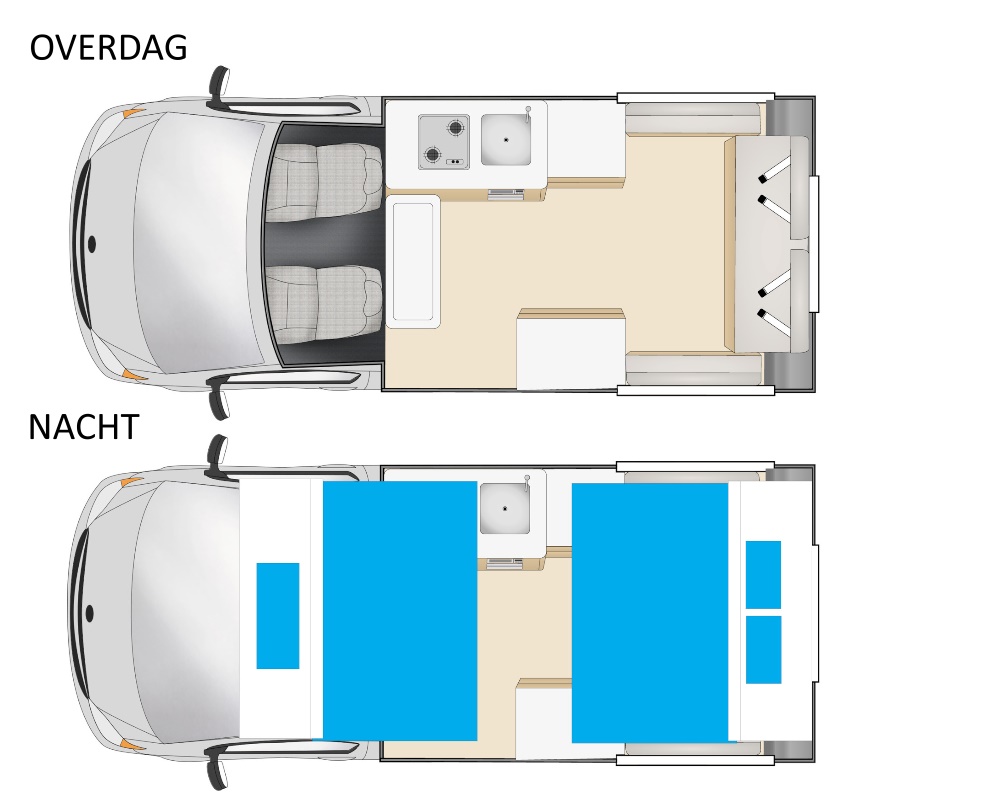 Compacte en aantrekkelijk geprijsde camper voor drie personen. Minimum leeftijd om deze camper te huren is 18 jaar. Er is alleen koud water en het woongedeelte is niet vanuit de bestuurderscabine te bereiken. De Hitop heeft een draagbaar toilet, maar geen douche. De camper is eenvoudig te besturen. Eén baby- of kinderzitje is mogelijk. Tweepersoonsbed achterin van 2.00 bij 1.20m en een eenpersoonsbed van 2.00 bij 1.37m (top bunk geschikt voor maximaal 200 kilo). Binnenhoogte is 2.10m. De genoemde afmetingen kunnen in de praktijk enigszins afwijken.