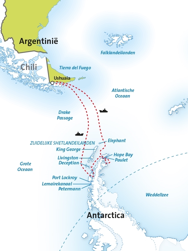 De overtocht naar Antarctica voert via de Drake Passage, genoemd naar de Britse ontdekkingsreiziger Sir Francis Drake die in 1578 als eerste door deze wateren voer. De komende twee dagen kunt u het zeemansleven vanuit het perspectief van de eerste poolreizigers lichtelijk meebeleven: een stevige bries, rollende golven en mogelijk al een walvis die plotseling opduikt en een ademspuit laat zien. U arriveert bij de Antarctische Convergentie. Dit is een natuurlijke afbakening die gevormd wordt waar koude noordwaartse oceaanstromingen en warmere subantarctische stromingen elkaar ontmoeten. Hierna bevindt u zich in de zogenaamde Antarctic Circumpolar Current. In deze oceanografische overgangszone kan de watertemperatuur in slechts enkele uren tijd sterk dalen. Koud, voedselrijk water wordt aan het oppervlak gebracht door de botsende zeestromingen en dit trekt veel zeevogels naar het schip. Verschillende albatrossoorten en stormvogels vertonen zich vrij plotseling, zoals ook Kaapse duiven en zuidelijke stormvogels. In de buurt van de Zuidelijke Shetlandeilanden, een eilandengroep van 20 eilanden, komen de eerste ijsbergen in zicht. (O,L,D)