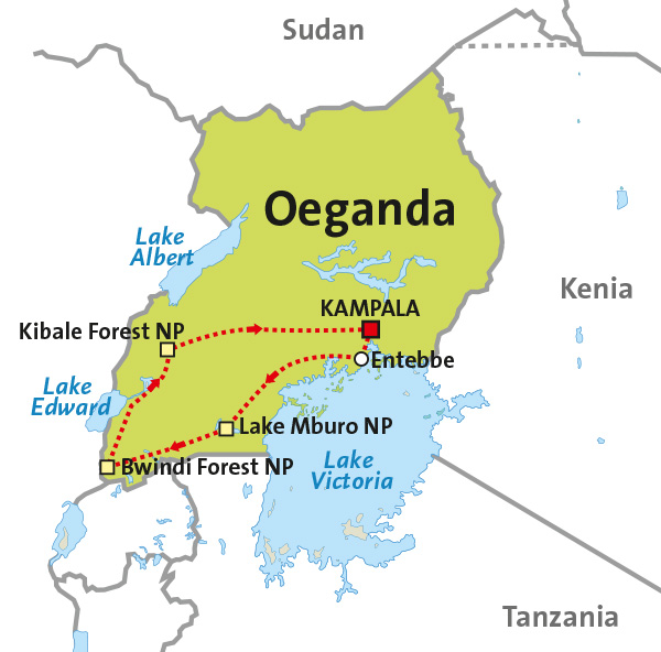 Na het ontbijt verlaat u Entebbe en rijdt naar Fort Portal, waar u stopt om te lunchen. Fort Portal ligt aan de voet van de Mountains of the Moon en is bekend vanwege de vele theeplantages. Hiervandaan rijdt u verder naar Kibale Forest National Park, het leefgebied van vele primaten. Kibale Forest National Park herbergt de grootste variëteit en concentratie van primaten in Oost-Afrika. Zo leven in dit kleine gebied van 776 vierkante kilometer niet minder dan 13 verschillende soorten, waaronder zwart-witte colobus apen, blauwe apen en grijswangige mangabeys. Belangrijker is dat het dichte bos een populatie van meer dan 1.000 chimpansees herbergt, waardoor bezoekers de unieke kans krijgen om deze mensapen in hun natuurlijke omgeving te bekijken. (O,L,D)