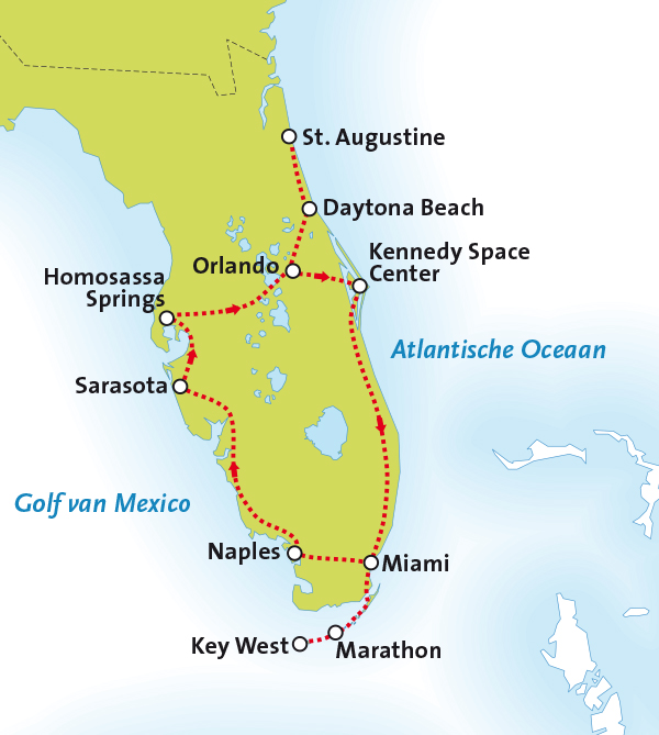 U keert terug naar Miami Beach voor een laatste overnachting in het zonovergoten Florida. Maar voor het zover is kunt u indien gewenst eerst het Kennedy Space Center bezoeken. Dit is de locatie van the American Space Program en de NASA centrale. Maak een excursie waar u onder andere de NASA faciliteiten en massieve lanceerplatforms van de Space Shuttle te zien krijgt. In het bezoekerscentrum kunt u interactieve simulators uitproberen. Wilt u liever wat minder rijden vandaag? Neem dan de rechtstreekse route naar Miami en geniet van de namiddag op Miami Beach.