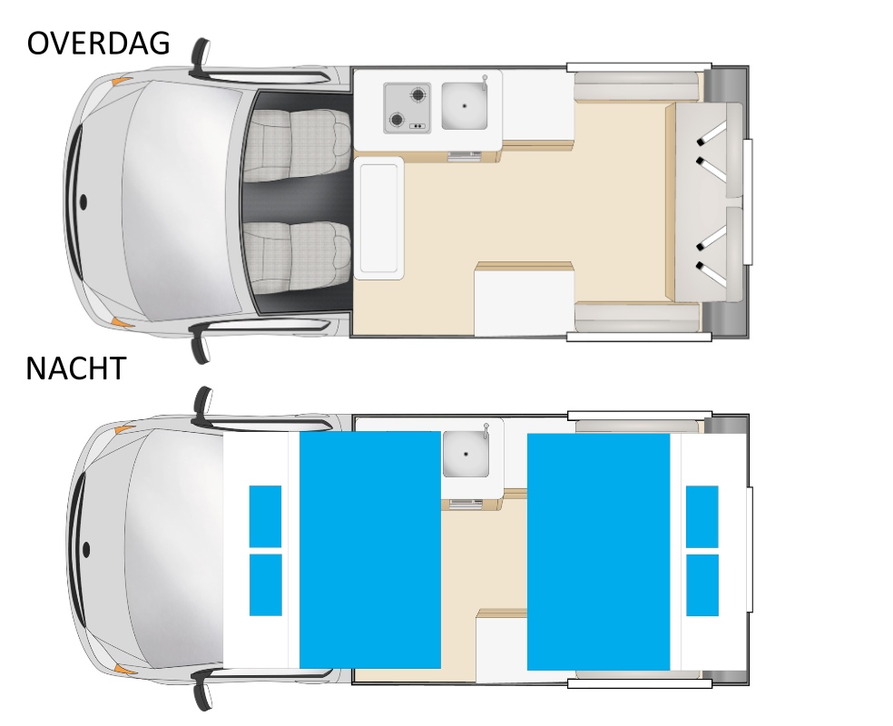 Voordelige familiecamper met beperkte ruimte. Niet te groot en eenvoudig in gebruik. Praktische ingang aan de zijkant. Minimum leeftijd om deze camper te huren is 18 jaar. Geschikt voor twee volwassenen en twee kleine kinderen. Twee babyzitjes of kinderzitjes zijn mogelijk. Er is een draagbaar toilet, maar geen douche en alleen koud water. Tweepersoonsbed van 2.00 bij 1.20m en tweepersoonsbed (top bunk) van 2.00 bij 1.37 m (maximaal gewicht van 200 kg). Binnenhoogte is 2.10m. De genoemde afmetingen kunnen in de praktijk enigszins afwijken.