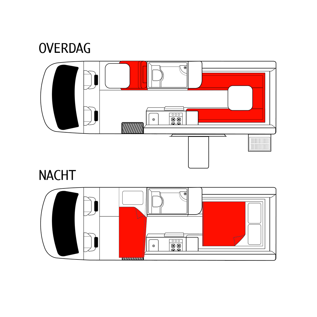 Ruime camper voor twee volwassenen en een kind. Inclusief douche en toilet en volledige keuken. Tweepersoonsbed achterin van 1.91 bij 1.78m en een eenpersoonsbed voor in de camper van 1.75 bij 0.66m. Binnenhoogte is 1.90m.